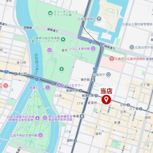 のぶすけは広電本線の紙屋町東駅と立町駅から徒歩3分の場所にあります。駅近くなので大人数での集合や解散にも便利。大きく灯る「肉」の看板が目印です!お気軽にご来店ください。